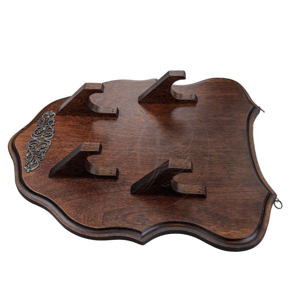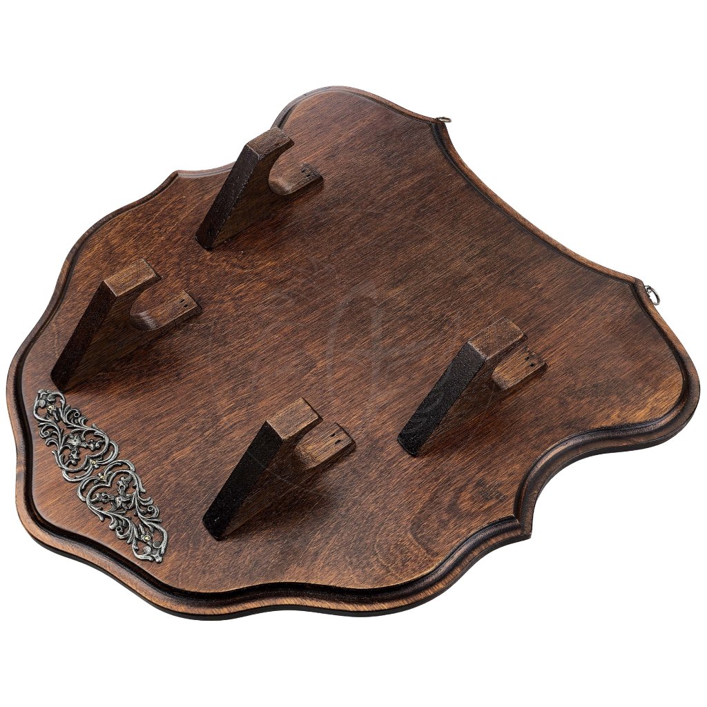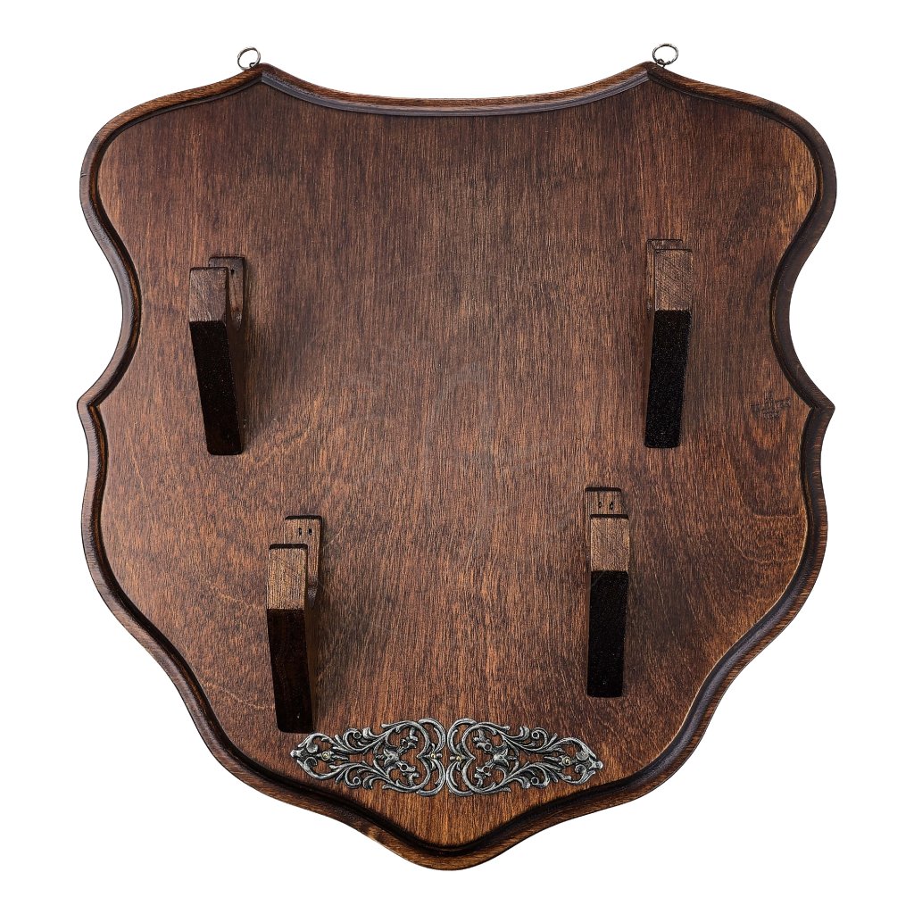 Tato elegantní dřevěná plaketa představuje ideální způsob, jak vystavit Vaše oblíbené repliky zbraní – od mečů přes historické křesadlové či perkusní pistole až po dýky. Díky robustní konstrukci z masivního lakovaného dřeva poskytuje bezpečnou a stabilní oporu, zatímco tmavé moření a kovový dekor dodávají celku luxusní a historický vzhled.