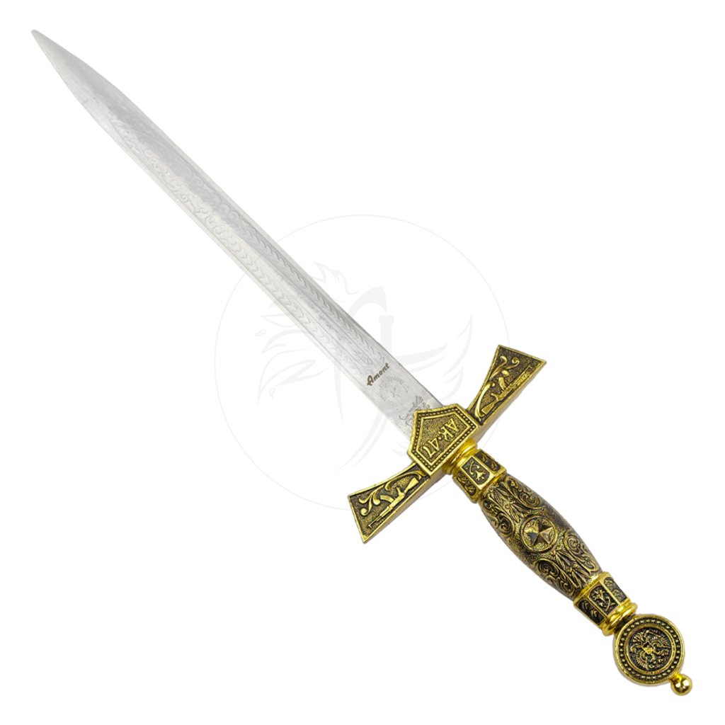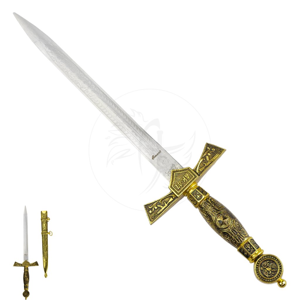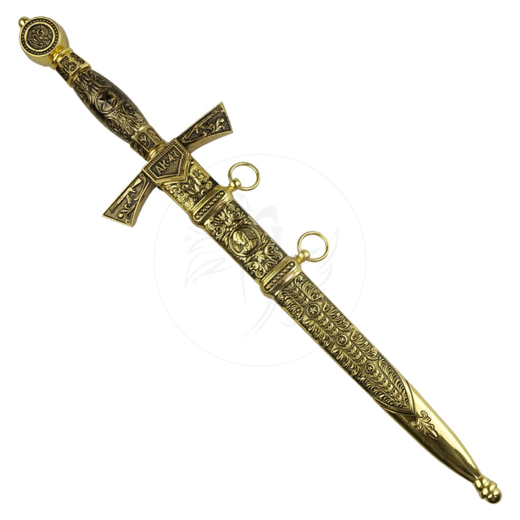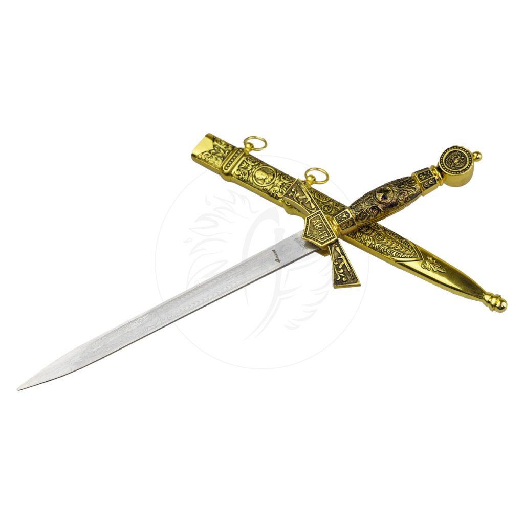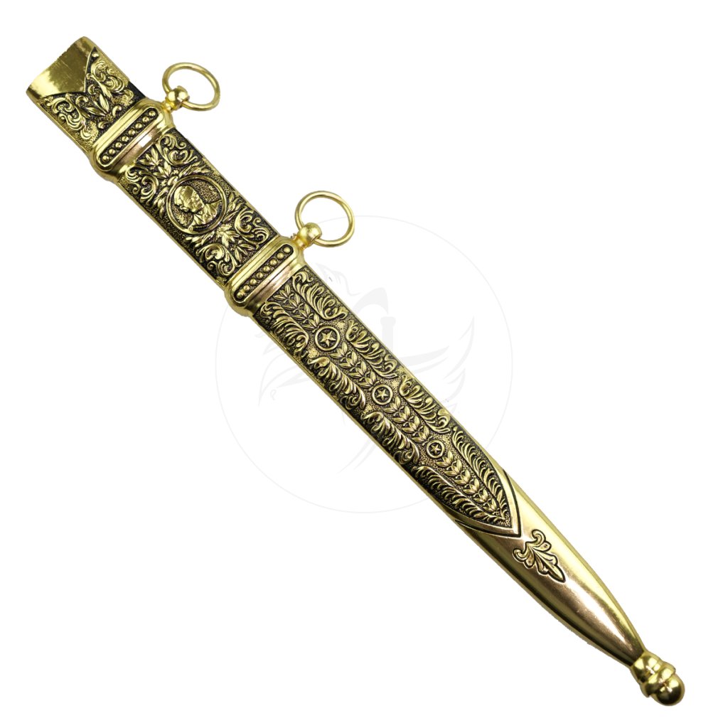 Tupá čepel této dýky je vyrobena z nerezové oceli 420, což jí dodává odolnost. Je to ideální materiál pro tento typ nože, protože se snadno udržuje a odolává rzi. Kromě samotné dýky získáte také celokovovou zlatou pochvu jako součást balení. Pochva chrání dýku před poškrábáním nebo poškozením během výstavy nebo skladování. Je vyrobena ze stejné kvalitní nerezové oceli jako čepel nože, což zajistí její dlouhodobou životnost.