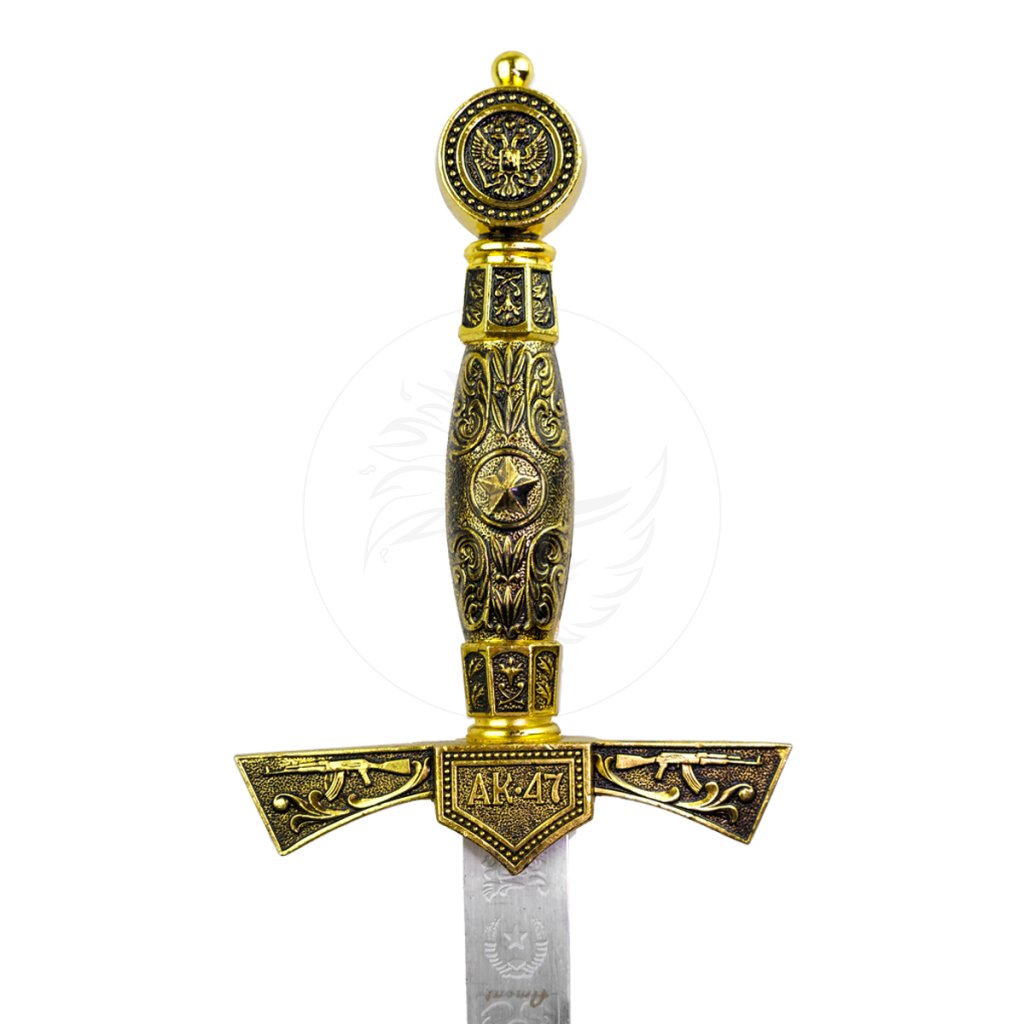 Zlatá celokovová dýka na motivy Michail Kalashnikov je dokonalou volbou pro sběratele zbraní nebo milovníky historie. Je to skvělý způsob, jak si připomenout významného konstruktéra a jeho nezapomenutelnou zbraň. Nechte se unést jedinečností a kvalitou této dýky na motivy AK-47.