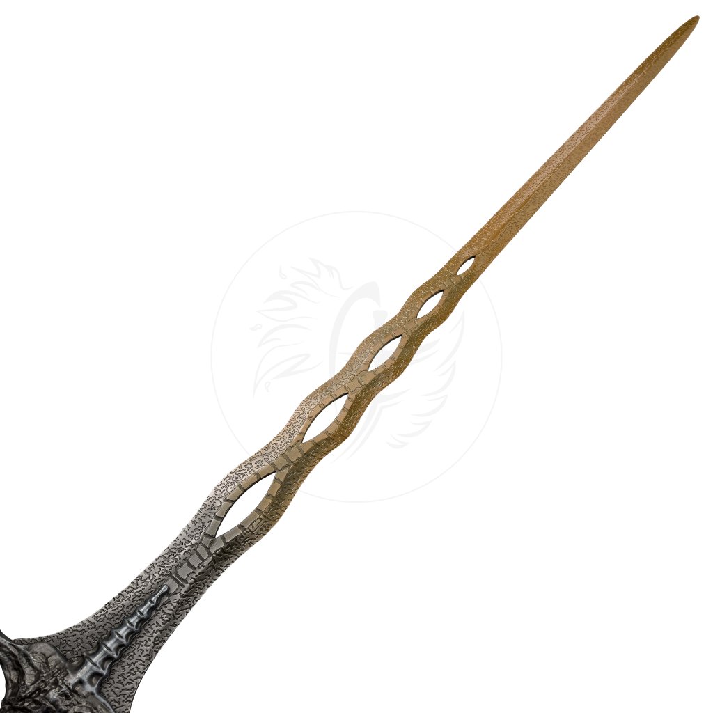 Replika „Sacred Relic Sword“ přináší věrné zpracování jedné z nejvýraznějších zbraní ze hry roku - Elden Ring. Ocelová čepel s charakteristickým vlnovitým profilem a průřezy působí monumentálně, zatímco kovová rukojeť i záštita precizně kopírují organicko-rituální vzhled známý ze hry. Povrchová textura připomíná starobylé kovářské postupy a dodává meči styl, který perfektně ladí s estetikou The Lands Between.