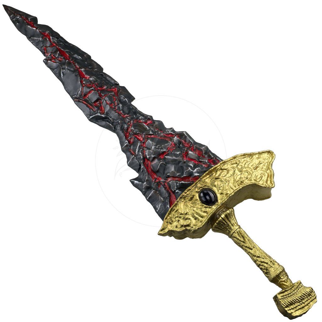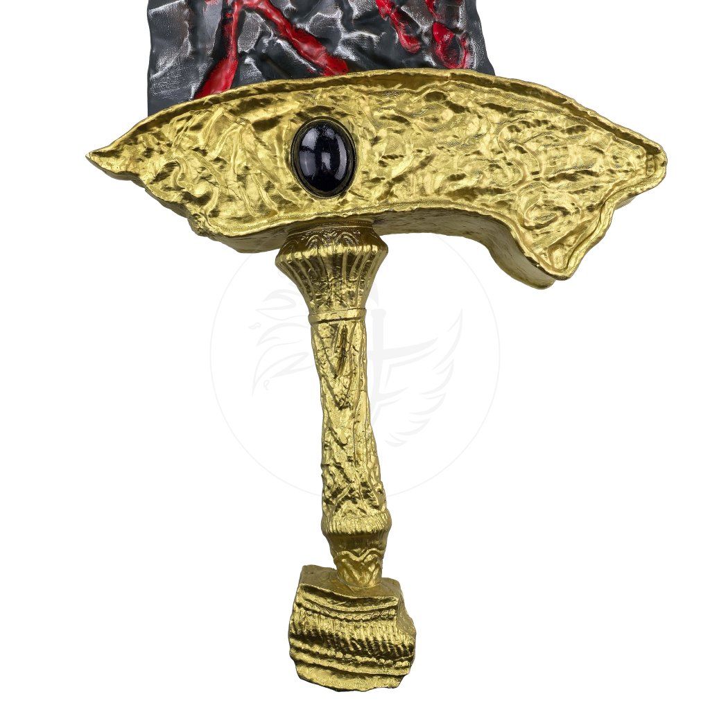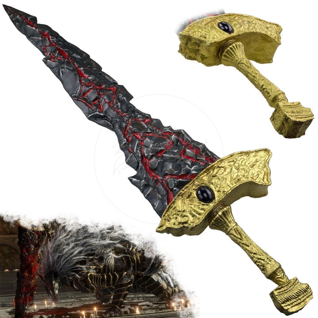 Tento masivní kus je vyroben z pevné pryskyřice, která umožňuje zachovat extrémně detailní zpracování s lehčí váhou. Povrch čepele je strukturovaný a doplněný o výrazné červené praskliny, které imitují energii Rune of Death. Rukojeť i záštita mají bohaté zdobení s tmavými prvky a kontrastními detaily, díky čemuž meč působí jako věrné zpracování herní předlohy. Díky materiálu je celek lehčí než kovové varianty této velikosti, ale stále působí robustně a dominantně.