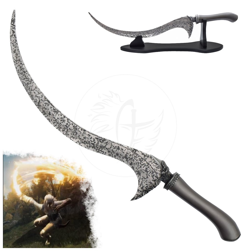Dýka „BLADE OF CALLING“ představuje dekorativní zbraň s výrazně zakřiveným profilem, který působí jako zbraň určená pro rychlý a přesný útok. Neostřená nerezová čepel s ornamentálním vzorem vypadají přesně jako z The Lands Between, díky čemuž je zbraň poutavá při jakémkoli vystavení. Ostrá špička a pozvolné zužování čepele zvýrazňují dynamiku tvaru a dodávají dýce elegantní, až mystický charakter.