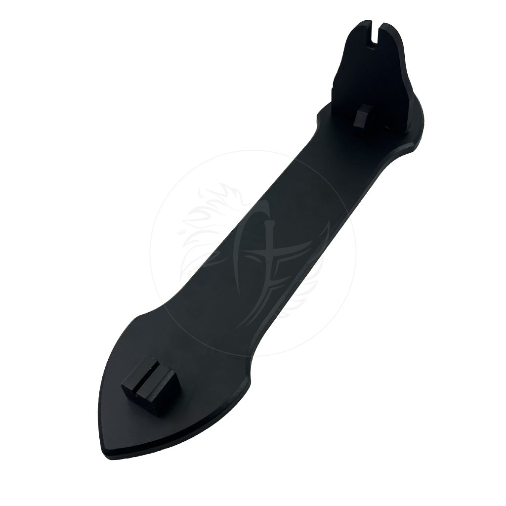 Pochva v kombinaci eko-kůže a dekorovaných vzorů chrání čepel a zároveň působí jako stylový doplněk vystaveného meče. Součástí balení je také dřevěný stojánek na stůl, díky kterému lze katanu elegantně prezentovat v herním pokoji či sběratelské poličce. Celkový dojem podtrhuje výrazná délka meče přes 110 cm, díky níž jde o jeden z nejpůsobivějších Elden-Ring inspirovaných kusů.