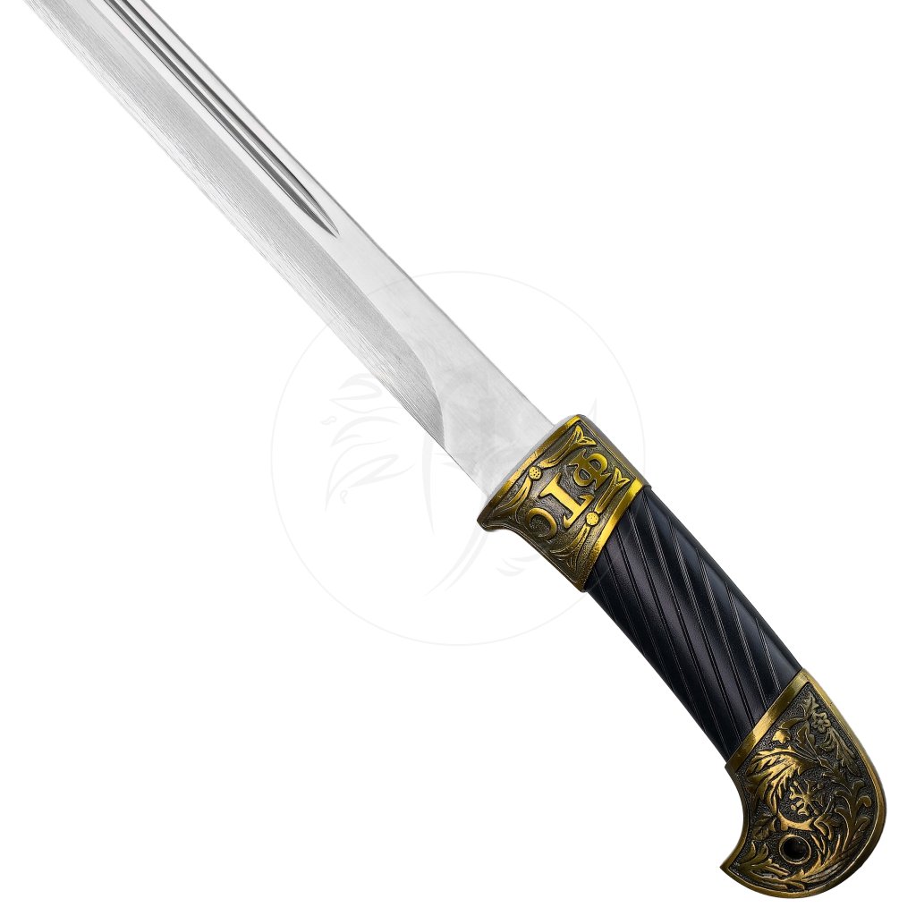 Rukojeť i pochva jsou zdobeny detailními kovovými ornamenty s historickými motivy, které dodávají celé zbrani nádech luxusu. Černá dřevěná pochva je vyztužena kovovými prvky v bronzové barvě, jež perfektně ladí s rukojetí. Součástí balení je i látkový háv pro bezpečné uskladnění a ochranu proti prachu.