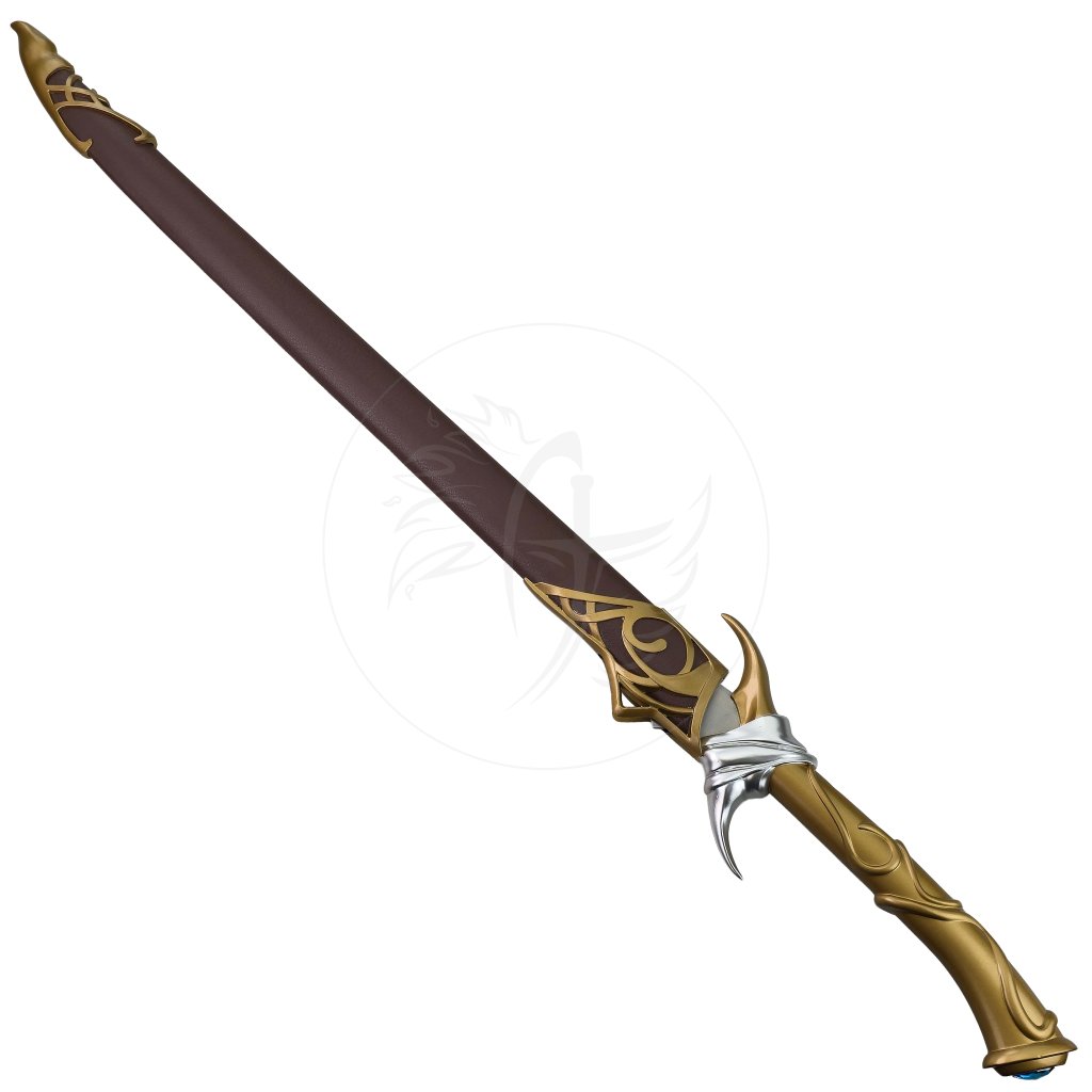 Čepel je vyrobena z nerezové oceli, která dodává meči realistickou hmotnost a lesk, přičemž zůstává zcela tupá, aby byla bezpečná pro vystavení i cosplay použití. Elegantní rukojeť se zdobeným povrchem je doplněna o stříbrné detaily a výrazný modrý drahokam v patce, přesně podle ikonického vzhledu herní i literární předlohy. Součástí je také dřevěná pochva potažená eko-kůží, která chrání čepel a zároveň podtrhuje luxusní vzhled celé repliky.
