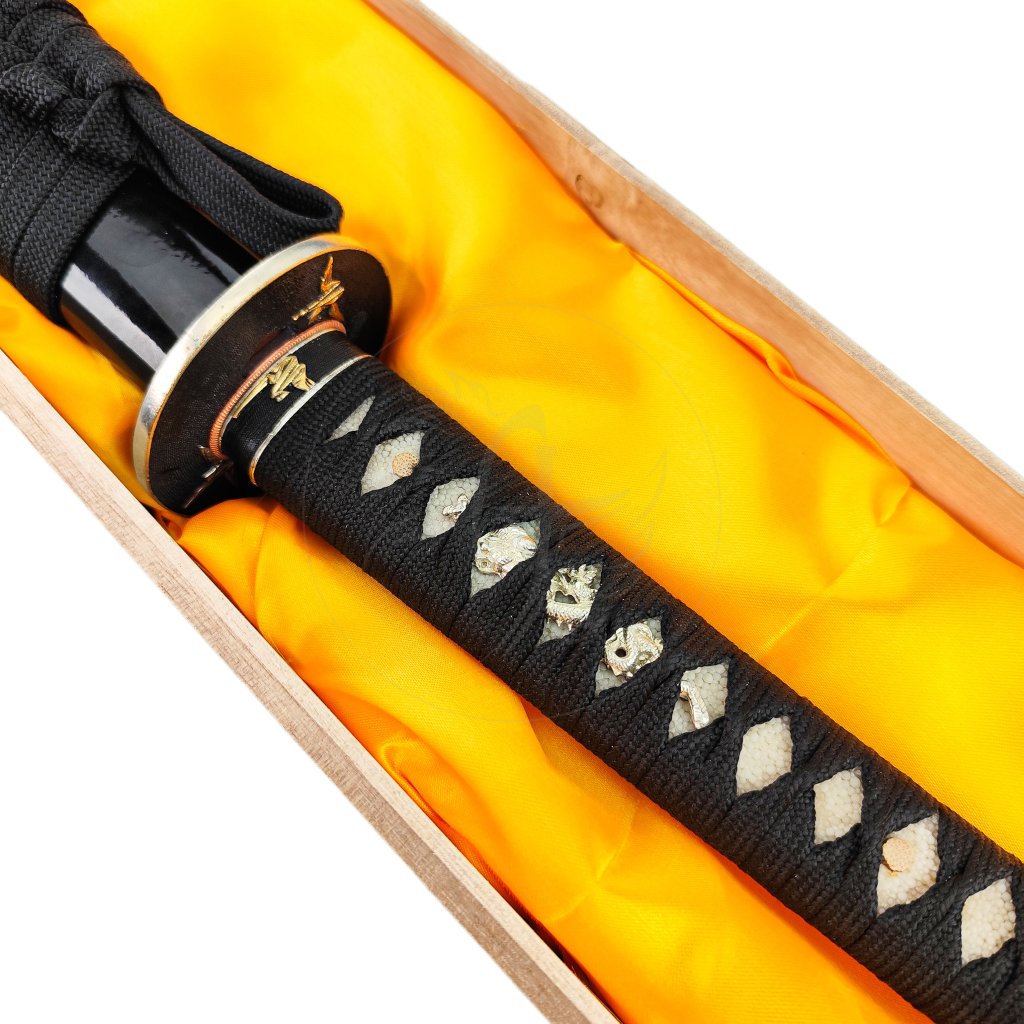 | Materiál: | Japonská ocel T10, rejnočí kůže, bavlna, ocel, bavlna, dřevo |