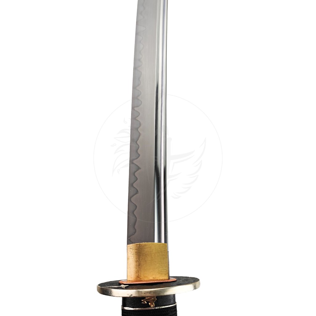 Čepel o délce 70 cm je vyrobena z vysoce uhlíkové oceli T10, známé pro svou extrémní tvrdost, výbornou houževnatost a schopnost udržet dokonale ostré ostří. Ocel byla kalená jílem (clay tempering), čímž vznikl pravý hamon – přirozená linie kalení, která potvrzuje tradiční zpracování. Tvrdost ostří (ha) dosahuje 60 HRC, zatímco hřbet (mune) má přibližně 40 HRC, což zajišťuje ideální poměr pružnosti a pevnosti pro tameshigiri (zkoušku seku).