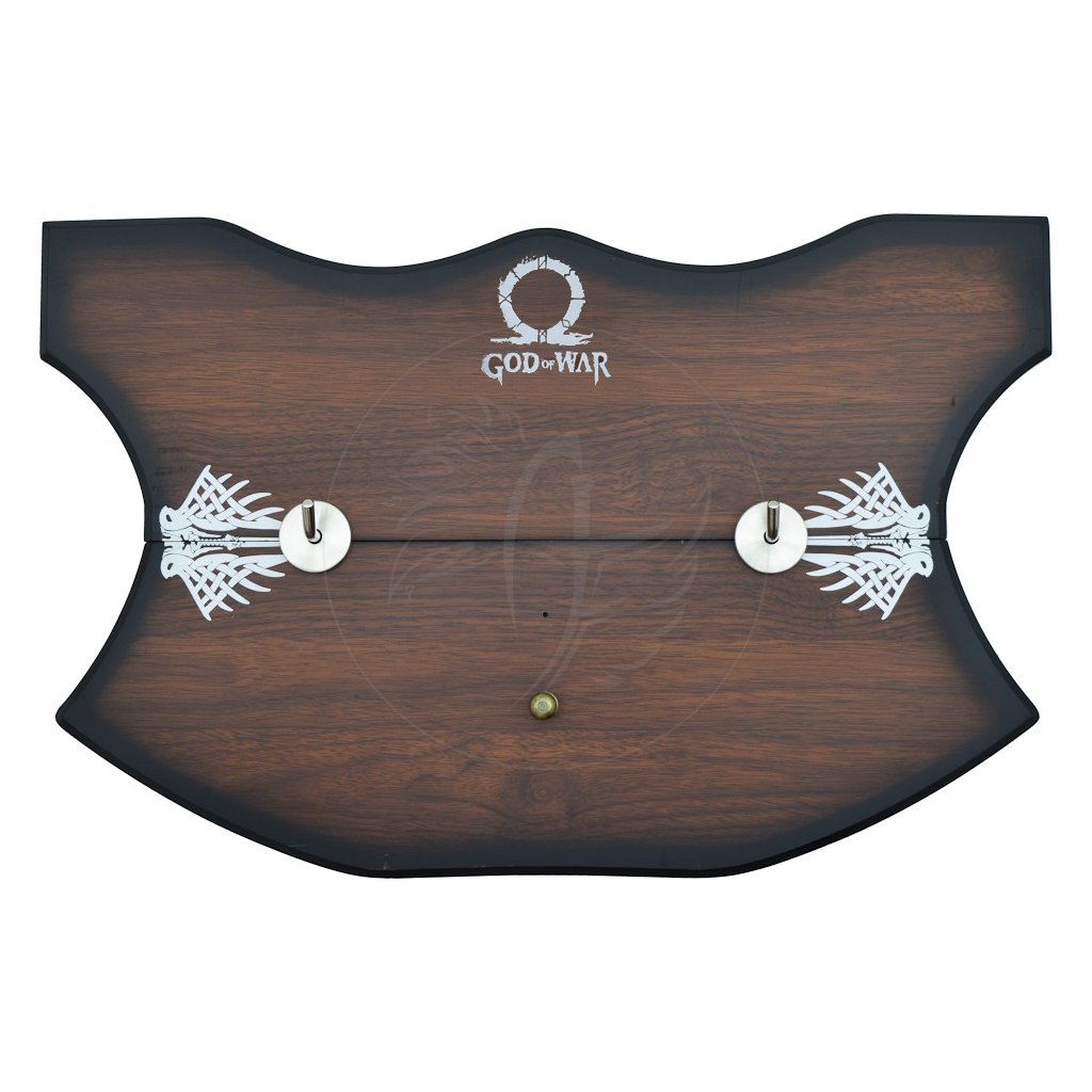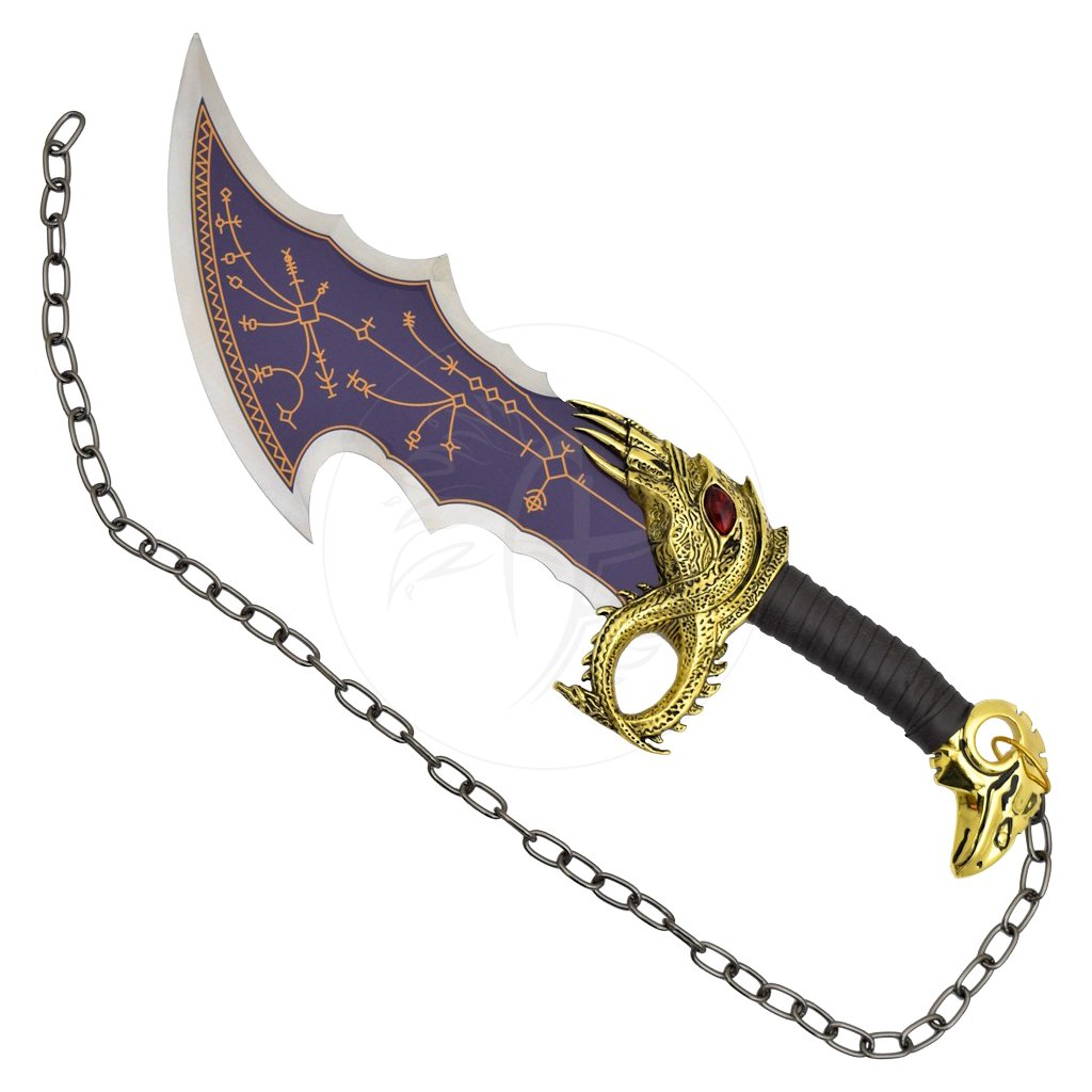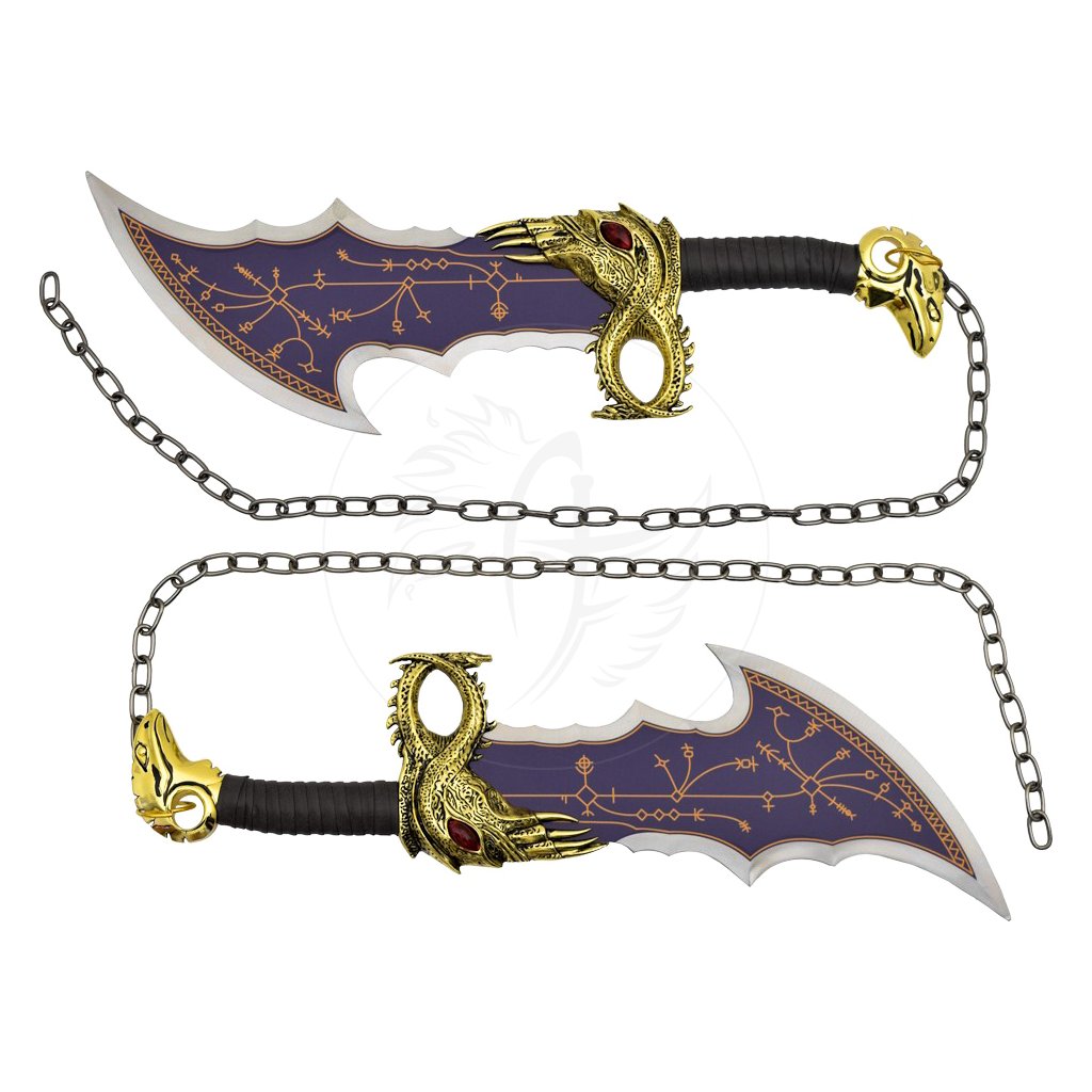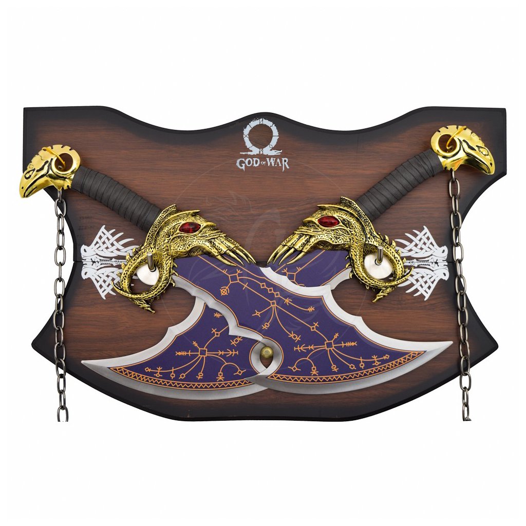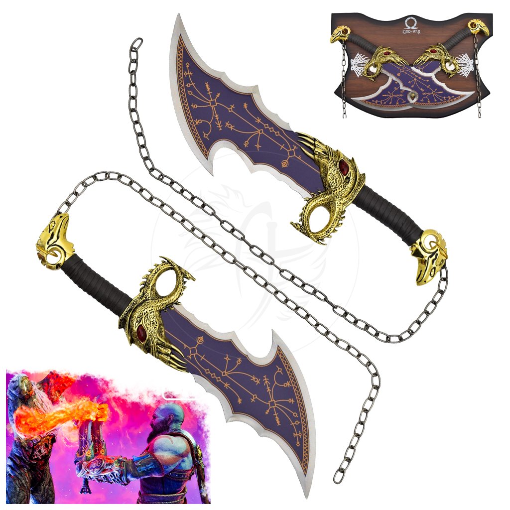 Každá čepel je vyrobena z nerezové oceli s precizně vyobrazenými runami a výrazným modro-zlatým designem, který věrně odpovídá zbraním z herní série God of War. Rukojeti jsou dřevěné, obalené černou omotávkou pro pevný úchop, doplněné o kovové zdobené záštity. Pevné ocelové řetězy zdobí obě čepele, čímž vzniká ikonický vzhled zbraní Kratose z mytologického světa Midgardu.