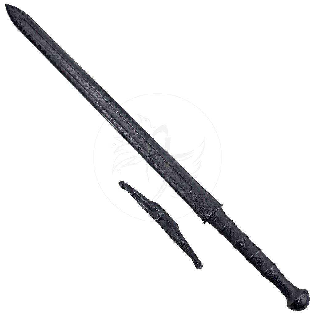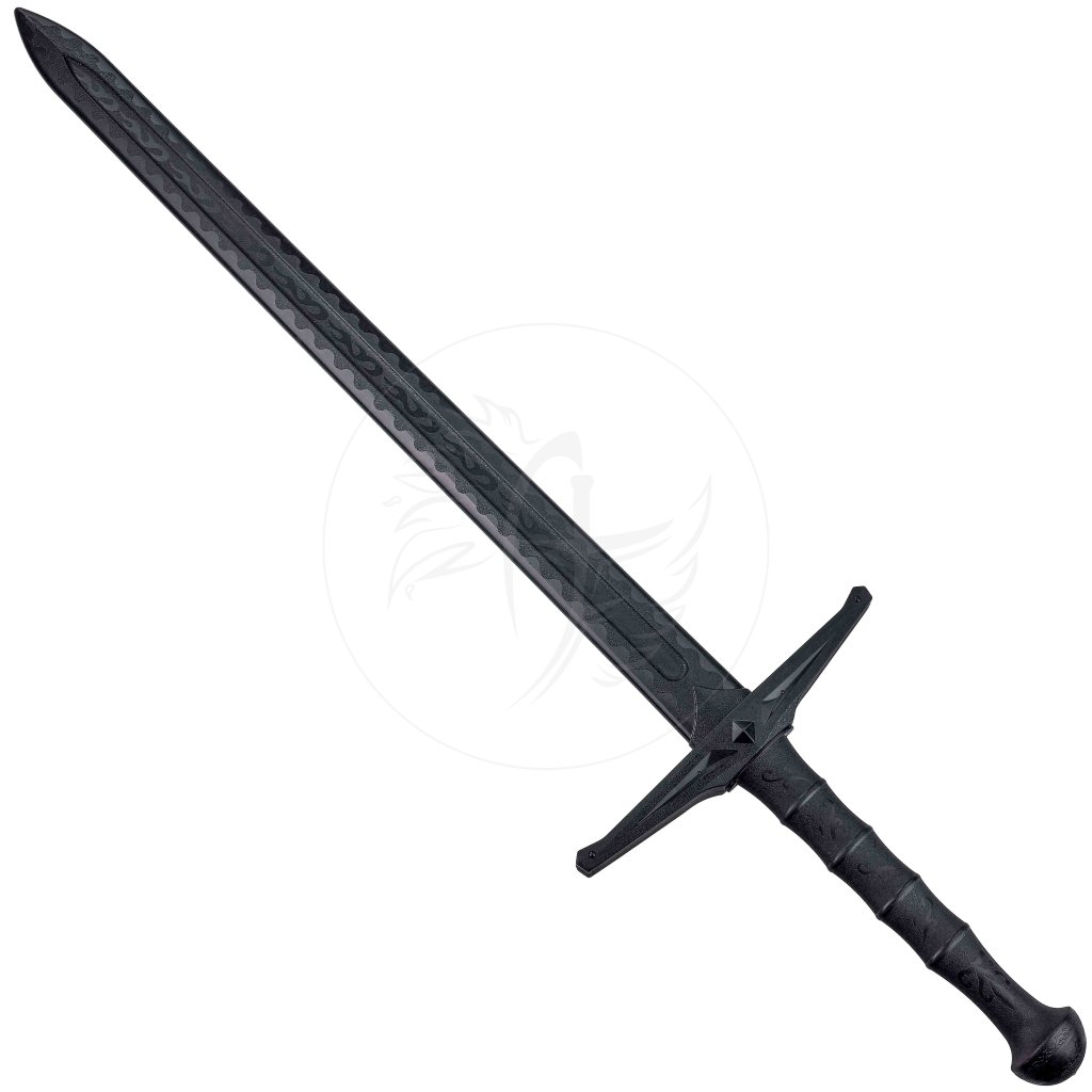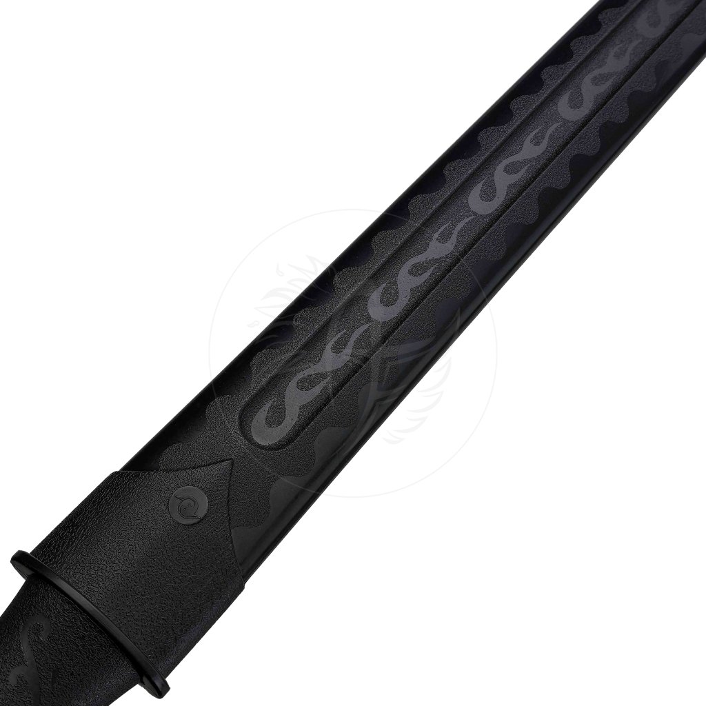 Tréninkový středověký meč vyrobený z odolného černého polypropylenu, který se vyznačuje vysokou pevností, nízkou hmotností a odolností vůči nárazům. Vzhledově připomíná klasický evropský meč s rovnou čepelí a výraznou záštitou, což z něj činí skvělou volbu pro nácvik technik a držení v různých bojových stylech. Na čepeli se poté vyjímá zdobení v podobě plamenů.
