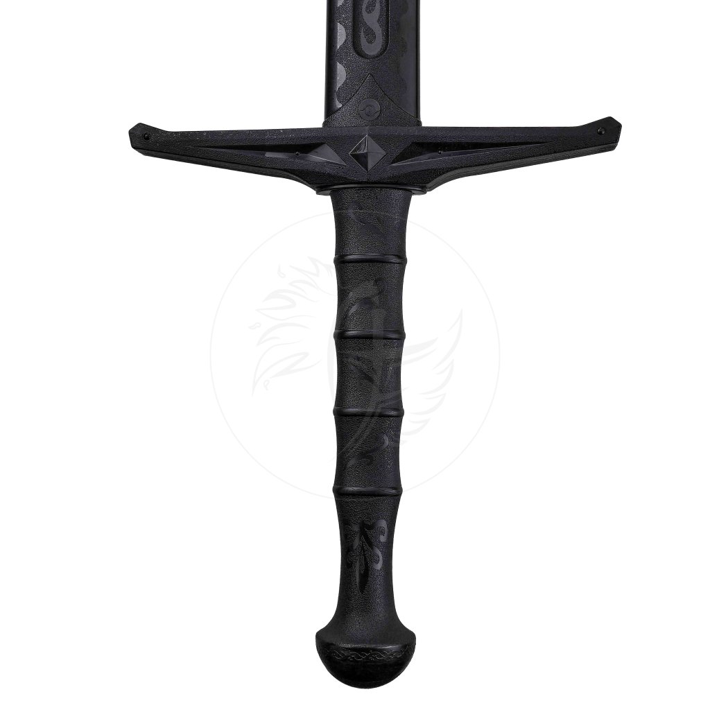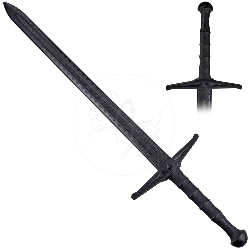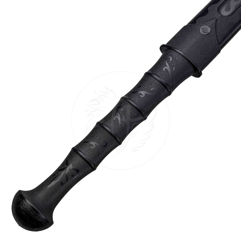 Tréninkový středověký meč vyrobený z odolného černého polypropylenu, který se vyznačuje vysokou pevností, nízkou hmotností a odolností vůči nárazům. Vzhledově připomíná klasický evropský meč s rovnou čepelí a výraznou záštitou, což z něj činí skvělou volbu pro nácvik technik a držení v různých bojových stylech. Na čepeli se poté vyjímá zdobení v podobě plamenů.