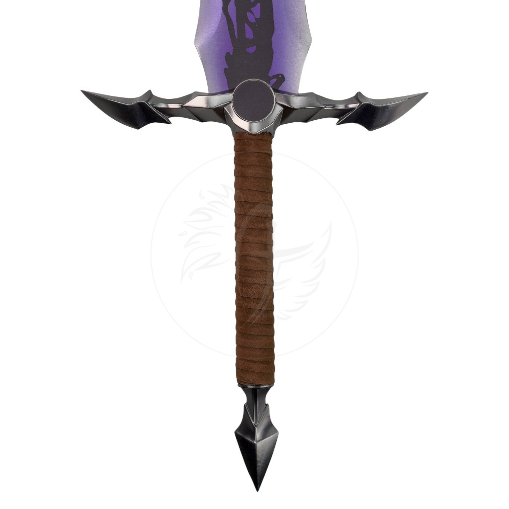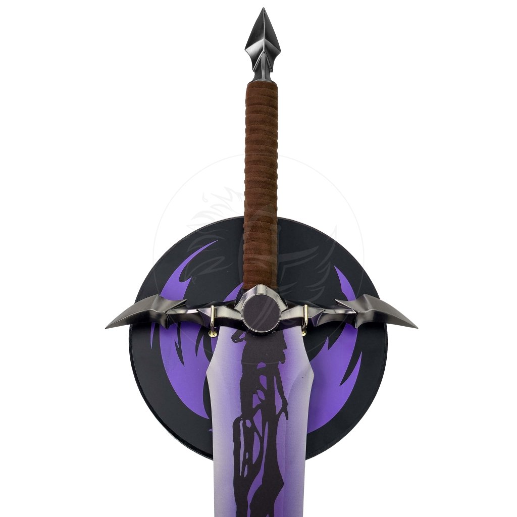 Masivní konstrukce kombinuje nerezovou ocel s fialovým přechodem a černými runami, které evokují magickou auru démonické síly. Čepel je tupá, avšak díky svému tvaru a délce působí mimořádně autenticky. Rukojeť s tkaninovou omotávkou perfektně padne do ruky a spolu s záštitou a hlavicí z hliníkové slitiny dodává meči ideální rovnováhu. Součástí je dřevěná plaketa pro zavěšení na stěnu, díky které se meč stane dominantou každé sbírky.