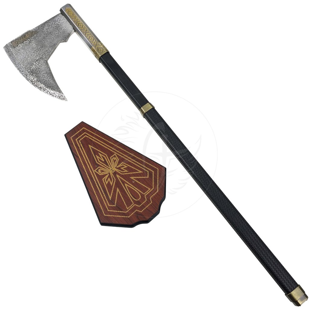 Sekera „GIMLI’S AXE“ je luxusní dekorativní replika, jejíž hlavice je vyrobena z nerezové oceli, doplněné o detaily ze slitiny hliníku. Každý detail, od zdobených rytin až po proporce čepele, byl navržen tak, aby odpovídal filmové verzi z trilogie Pána prstenů (LOTR).