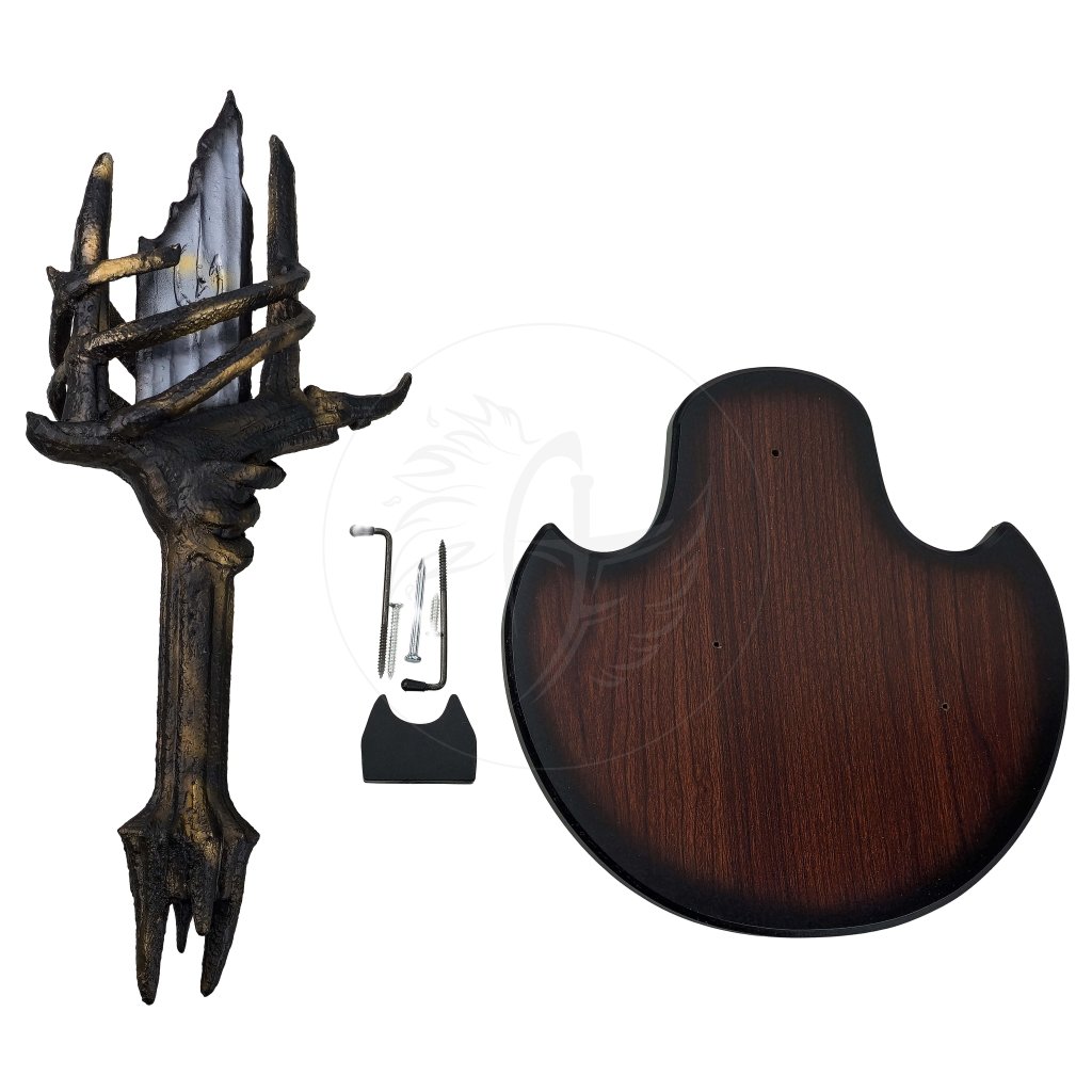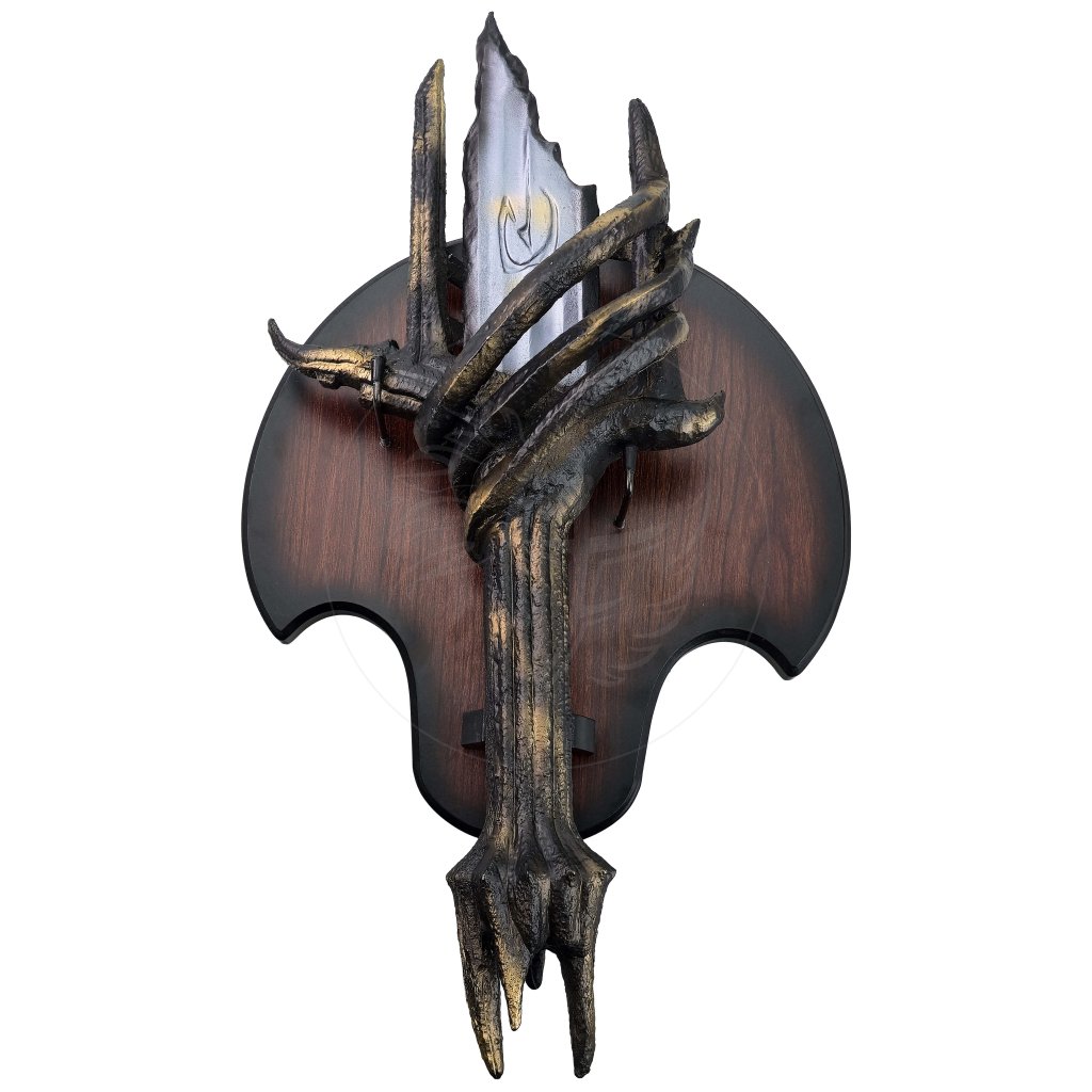 Součástí balení je dřevěná plaketa pro zavěšení na zeď, která umožňuje důstojné vystavení tohoto temného artefaktu. Díky své hmotnosti a robustní konstrukci se jedná o skutečně reprezentativní kus, který dodá charakter každé sbírce fantasy zbraní.