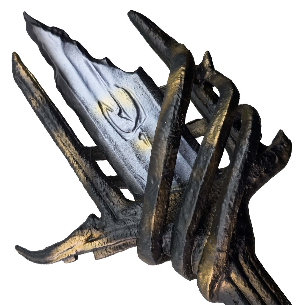 Rukojeť je celokovová, precizně zpracovaná s detailní strukturou imitující černou kovanou zbroj. Povrch je ručně lakován s bronzovými a zlatavými akcenty, které podtrhují temný, majestátní vzhled. V centru rukojeti je zasazena ocelová část čepele, jejíž design symbolizuje moc a destrukci, kterou Sauron zosobňuje.