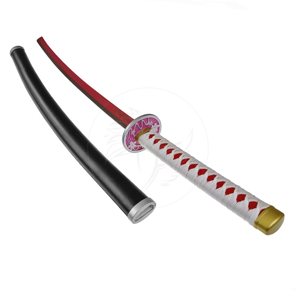 Na spodní straně čepele najdeme Japonské znaky, které znamenají "Ničit démony". Na čepel navazuje zdobená záštita kruhového tvaru, která je zdobena květinami. Plastová rukojeť červené barvy o délce 26,6 centimetrů, je obalena v opletu z bílé bavlny. Rukojeť Vám díky svému tvaru krásně zapadne do ruky a díky jejímu povrchu je pohodlná na dotek.