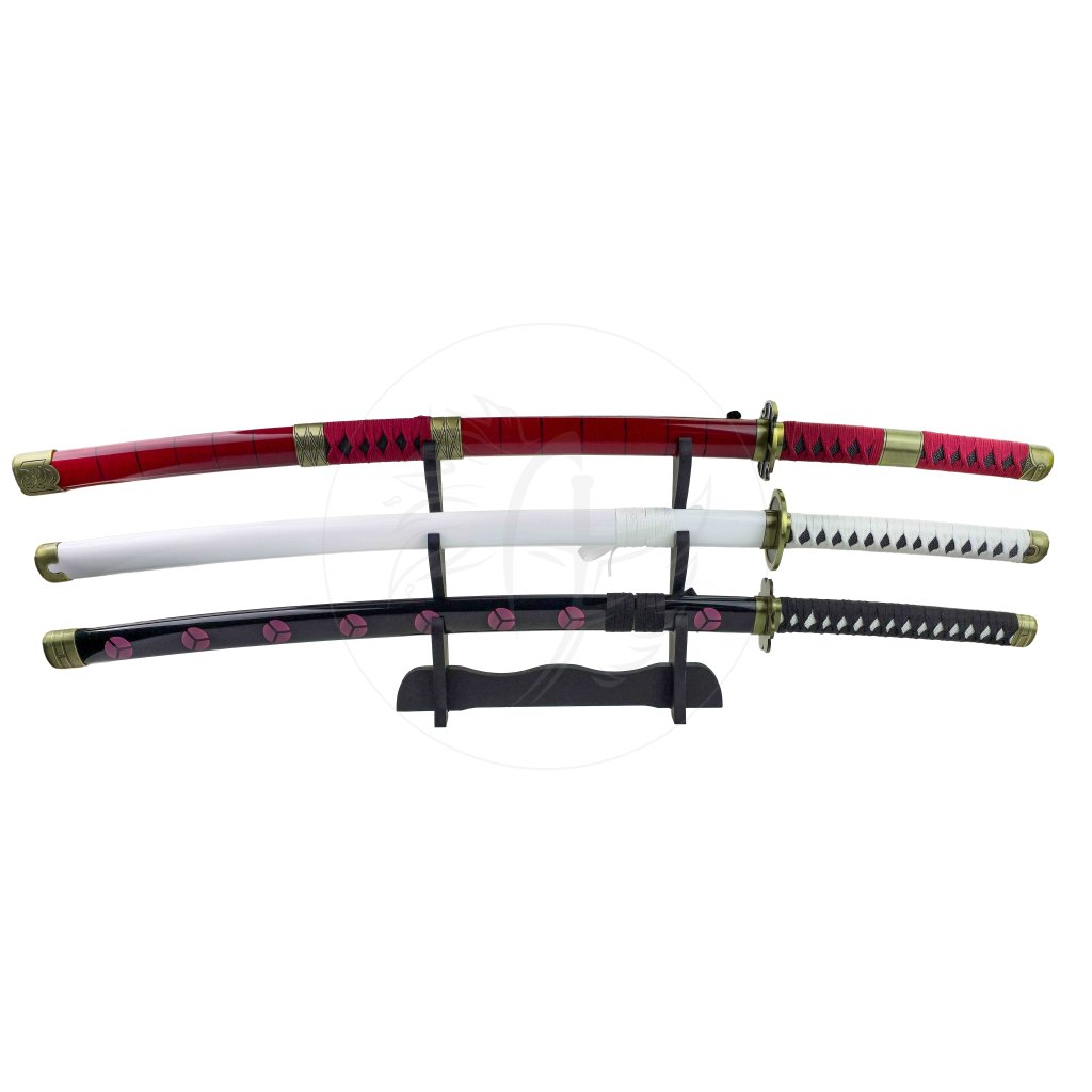 Roronoa Zoro, nejslavnější šermíř světa One Piece, je známý svým unikátním stylem boje „Santoryu“ – tedy stylem tří mečů, kde používá jeden meč v každé ruce a třetí drží v ústech. Tato sada obsahuje věrné repliky jeho tří ikonických katan: Wado Ichimonji (bílá katana), Sandai Kitetsu (červená katana) a Shusui (černá katana se světle fialovým zdobením). Každá z těchto zbraní má svůj příběh, význam i charakter, což z této sady dělá jedinečný sběratelský kousek pro každého fanouška One Piece, nebo sběratele.