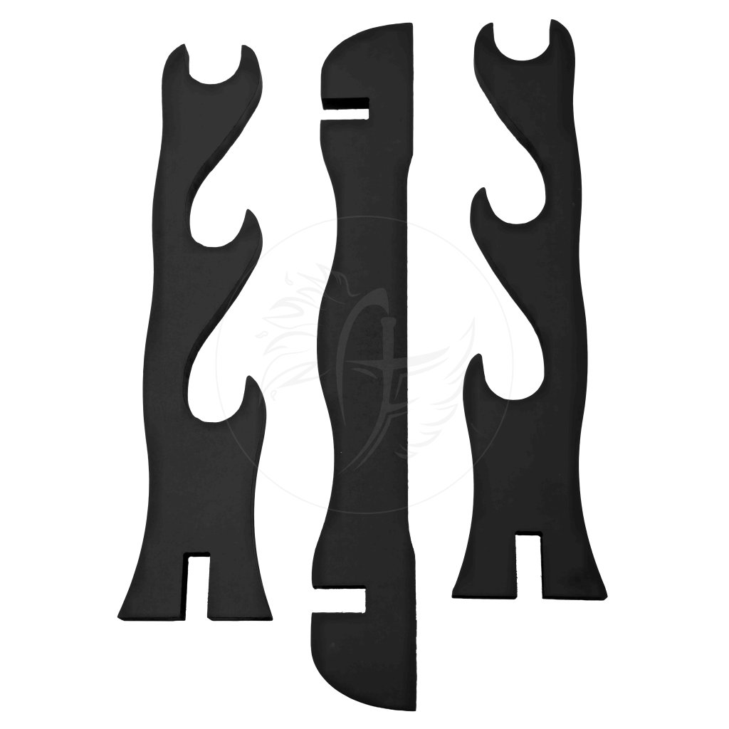 Čepele mečů jsou vyrobeny z karbonové oceli a nejsou ostřené, což je ideální pro bezpečné vystavení nebo cosplay. Záštity jsou kovové a detailně zpracované podle předlohy, rukojeti opletené tradičním stylem. Dřevěné pochvy odpovídají barevnému provedení jednotlivých katan. Balení obsahuje i jednoduchý dřevěný stojánek, díky kterému si můžeš své meče vystavit přesně tak, jak to odpovídá Zorově legendě.