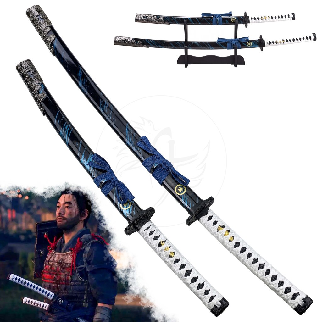 Sada dvou ikonických mečů inspirovaných legendární hrou Ghost of Tsushima, kde katana a wakizashi provázely Jina Sakaiho v boji proti Mongolské invazi vedené Khotan Khanem. Zbraně připomínají nejen jeho cestu mezi ctí samuraje a stínem ducha, ale i nezapomenutelné bitvy v lokalitách jako Castle Kaneda, Golden Temple či Iki Island. Meče neslouží pro kontaktní šerm!