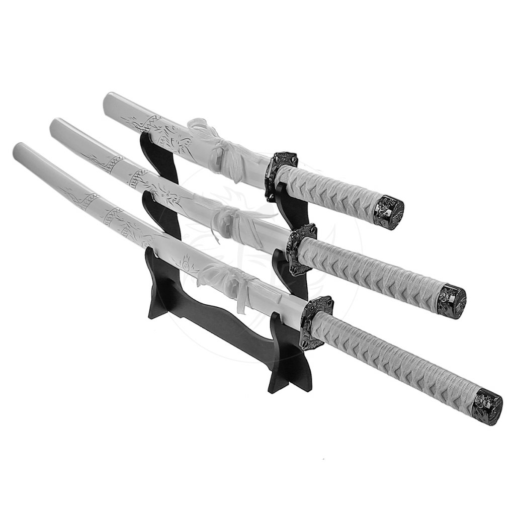 Krásná bílá sada samurajských mečů obsahuje malý (tantó), střední (wakizaši) a velký samurajský meč (katana). Pochvy mečů jsou z pravého dřeva s kovovými detaily! Čepele jsou středně naostřené pro lepší design a s lépe povedeným hamonem, nežli u sad bez ADVANCED v názvu. A hlavně - jsou DELŠÍ! Zde se již materiálem nešetřilo a délka katany dosahuje 94 cm! Sada je tedy krásná nejen na pohled v sadě, ale i po vytažení z pochvy ;-)